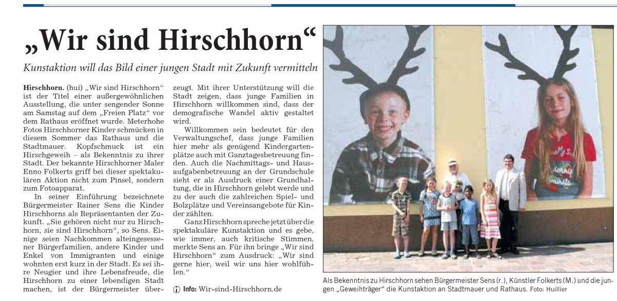 Die Perle des Neckartals ist eine junge Stadt in der sich Menschen unterschiedlichster Prägung wohl fühlen und sich gut verstehen. Das bringt der Hirschhorner Künstler Enno Folkerts mit einer großen Kunstaktion treffend zum Ausdruck: Großformatige Fotos von Kindern die voller Stolz ein "Hirschgeweih" als Bekenntnis zu ihrer Stadt tragen, werden im Sommer das Rathaus und die Stadtmauer schmücken.